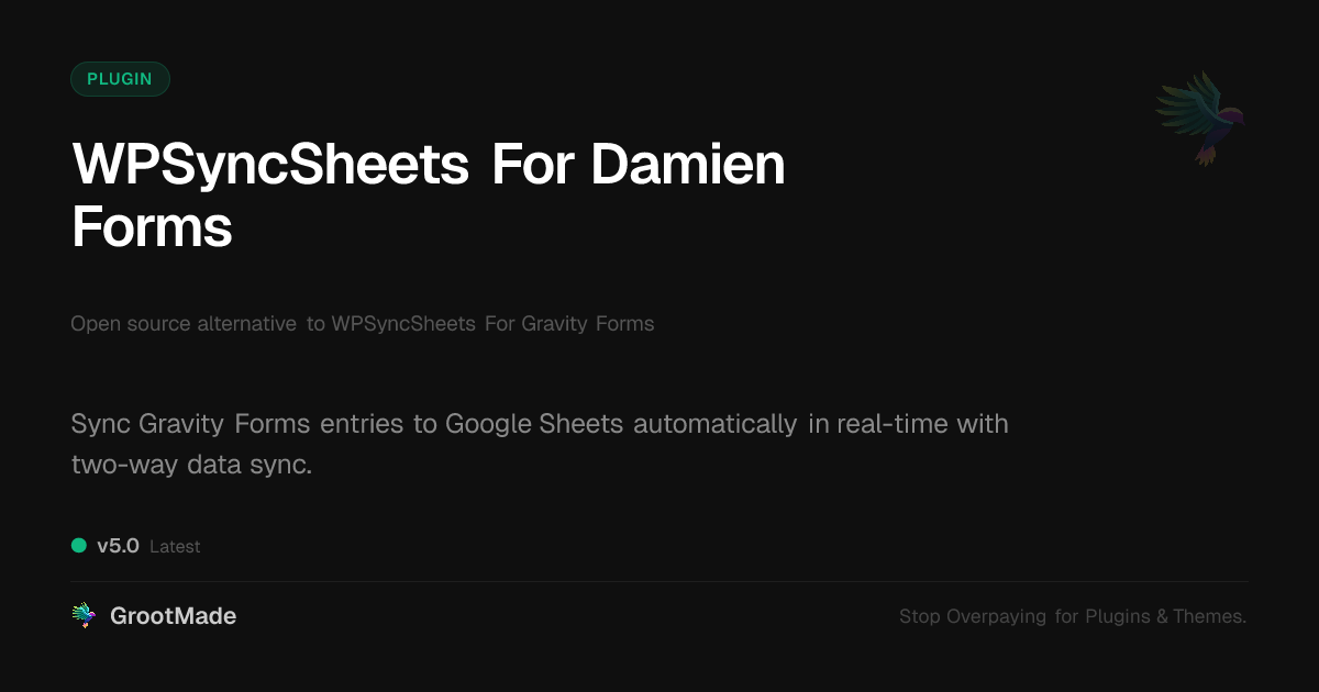 GrootMade is NOT affiliated with WPSyncSheets For Gravity Forms or its original author. WPSyncSheets For Gravity Forms™ is a trademark of its respective owner and use of it does not imply any endorsement or affiliation. This product has been forked under the GNU General Public License (GPL) and all non-GPL assets (such as proprietary images, fonts, and branding) have been removed. Distributing GPL-licensed code is 100% legal.