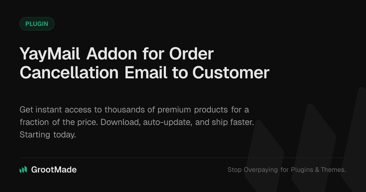 GrootMade is NOT affiliated with YayMail Addon for Order Cancellation Email to Customer or its original author. YayMail Addon for Order Cancellation Email to Customer™ is a trademark of its respective owner and use of it does not imply any endorsement or affiliation. This product has been forked under the GNU General Public License (GPL) and all non-GPL assets (such as proprietary images, fonts, and branding) have been removed. Distributing GPL-licensed code is 100% legal.