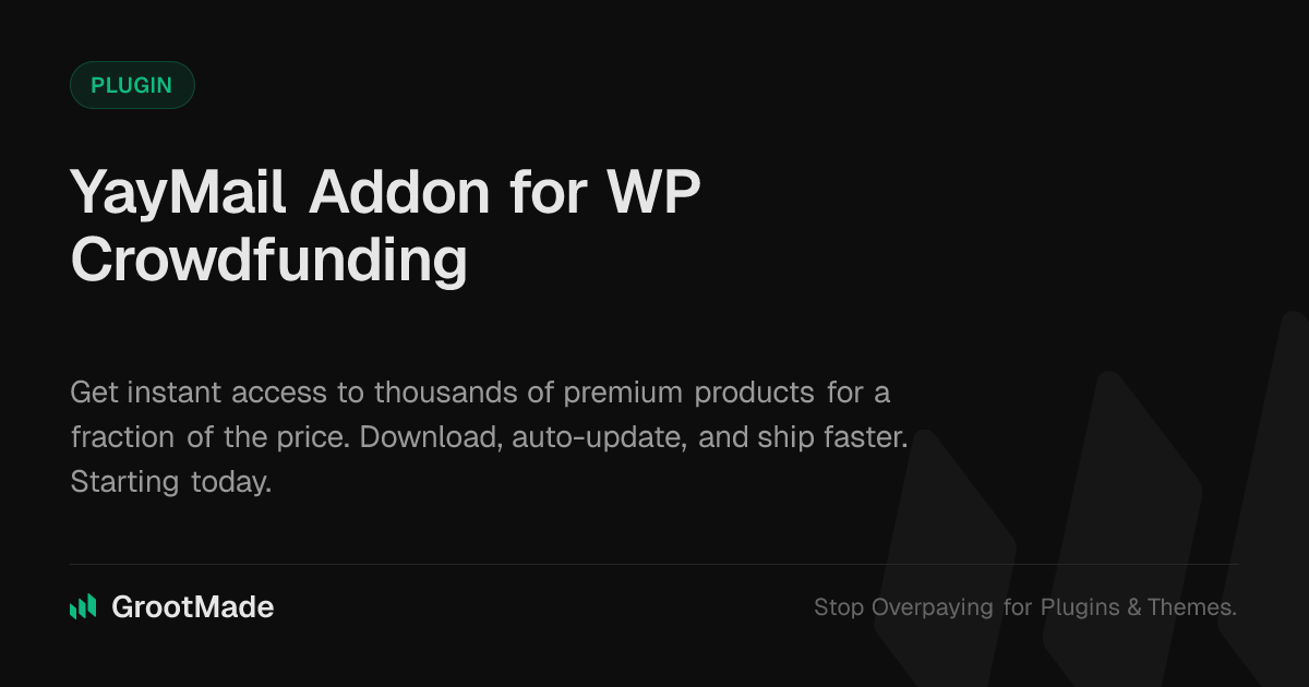 GrootMade is NOT affiliated with YayMail Addon for WP Crowdfunding or its original author. YayMail Addon for WP Crowdfunding™ is a trademark of its respective owner and use of it does not imply any endorsement or affiliation. This product has been forked under the GNU General Public License (GPL) and all non-GPL assets (such as proprietary images, fonts, and branding) have been removed. Distributing GPL-licensed code is 100% legal.