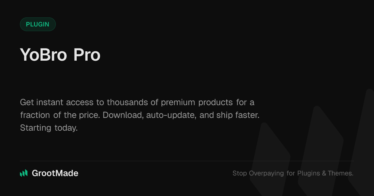 GrootMade is NOT affiliated with YoBro Pro or its original author. YoBro Pro™ is a trademark of its respective owner and use of it does not imply any endorsement or affiliation. This product has been forked under the GNU General Public License (GPL) and all non-GPL assets (such as proprietary images, fonts, and branding) have been removed. Distributing GPL-licensed code is 100% legal.