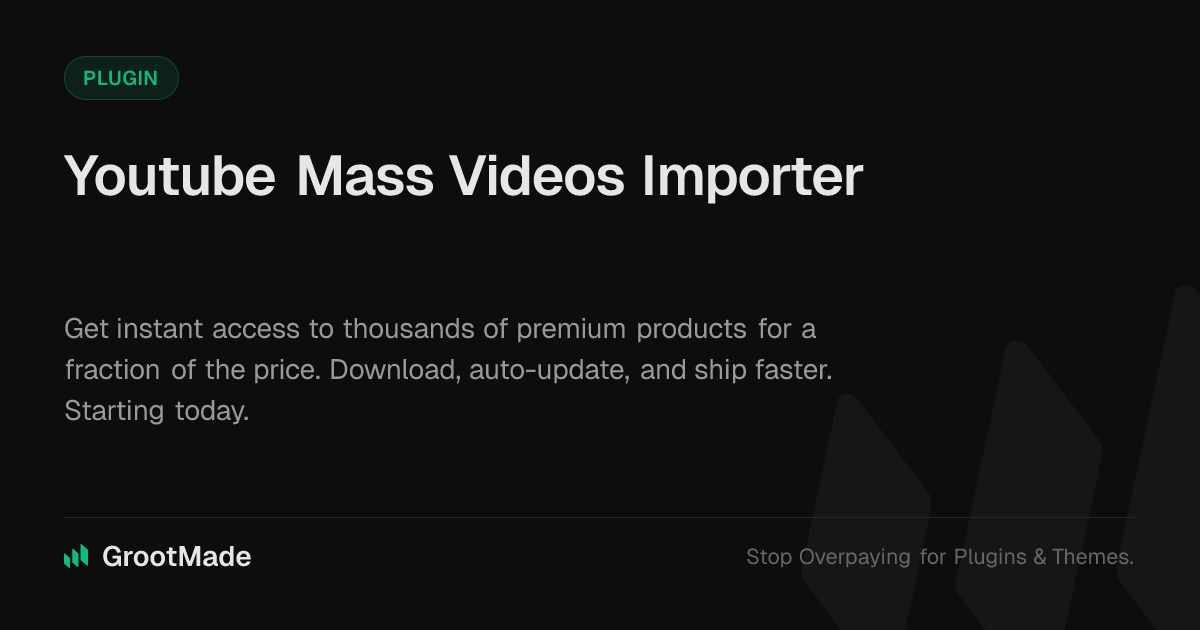 GrootMade is NOT affiliated with Youtube Mass Videos Importer or its original author. Youtube Mass Videos Importer™ is a trademark of its respective owner and use of it does not imply any endorsement or affiliation. This product has been forked under the GNU General Public License (GPL) and all non-GPL assets (such as proprietary images, fonts, and branding) have been removed. Distributing GPL-licensed code is 100% legal.