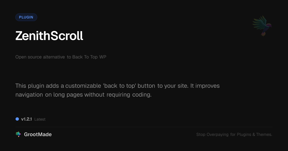 GrootMade is NOT affiliated with Back To Top WP or its original author. Back To Top WP™ is a trademark of its respective owner and use of it does not imply any endorsement or affiliation. This product has been forked under the GNU General Public License (GPL) and all non-GPL assets (such as proprietary images, fonts, and branding) have been removed. Distributing GPL-licensed code is 100% legal.