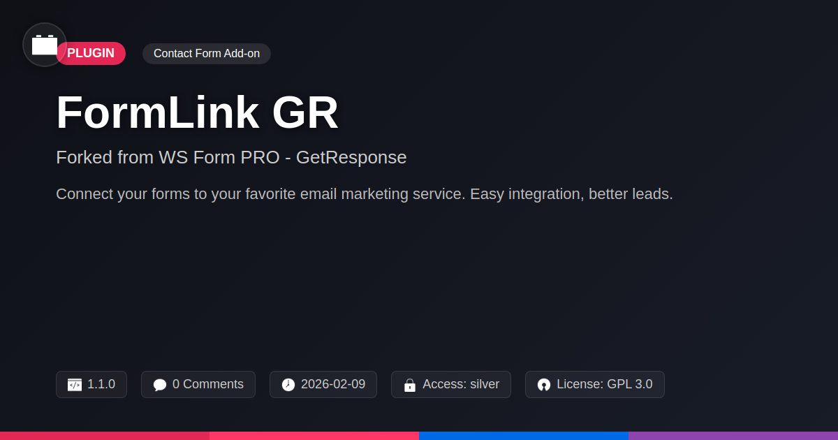 GrootMade is NOT affiliated with WS Form PRO - GetResponse or its original author. WS Form PRO - GetResponse™ is a trademark of its respective owner and use of it does not imply any endorsement or affiliation. This product has been forked under the GNU General Public License (GPL) and all non-GPL assets (such as proprietary images, fonts, and branding) have been removed. Distributing GPL-licensed code is 100% legal.